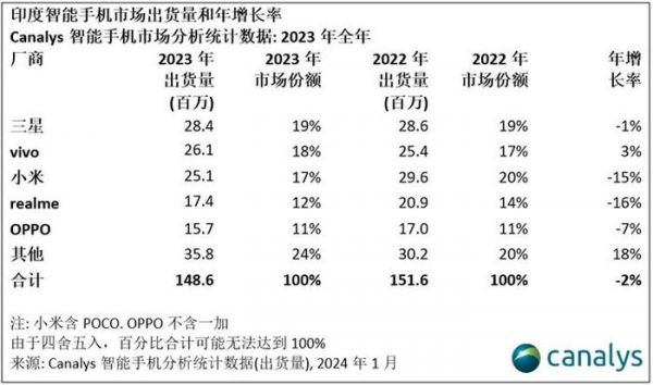 不过根据Canalys关于印度智能手机市场的调研报告显示,小米2023年在印度市场的表现不如人意,销量已经被三星和vivo反超,从去年的市场排名第一掉落至第三。
