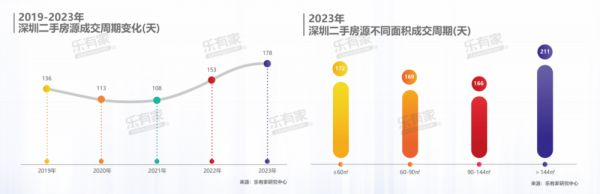 2023年,深圳二手房成交周期平均为178天,比2022年增加近1个月。近5年里,成交周期最短是2021年的108天。受改善型买家积极入市影响,90-144平方米的二手房成交周期最短,为166天;低于60平方米的刚需户型,成交周期为172天;144平方米以上户型,因为总价高、客群少,成交周期最长,为211天。
