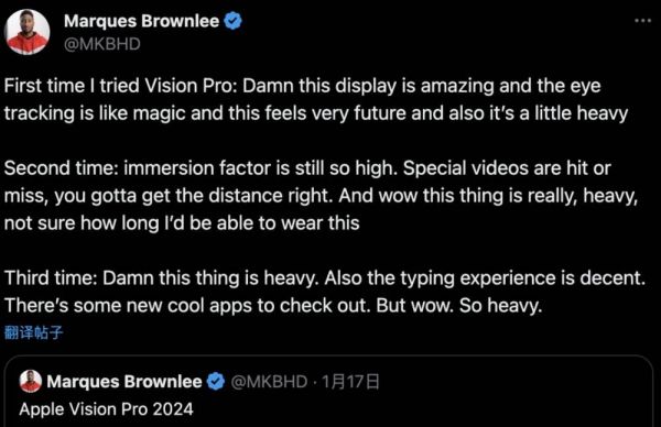 他在自己的社交软件X上写道:“当我第一次尝试Vision Pro:显示屏太棒了,眼动追踪就像魔法一样,感觉非常未来,但有点重。第二次:沉浸感仍然很高。空间视频体验时好时坏,你必须掌握正确的距离。这东西真的很重,不知道我能穿多久。第三次:这东西太重了。打字体验也不错。有一些新的很酷的应用程序可供查看。但是,好重。”