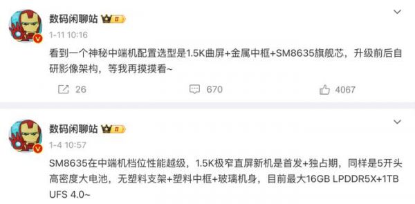 而在更早之前的爆料中,同一位博主曾提到过“SM8635在中端机档位性能越级,1.5K极窄直屏新机是首发+独占期,同样是5开头高密度大电池,无塑料支架+塑料中框+玻璃机身,目前最大16GB LPDDR5X+1TB UFS 4.0~”“看到一个神秘中端机配置选型是1.5K曲屏+金属中框+SM8635旗舰芯,升级前后自研影像架构,等我再摸摸看~”等信息。