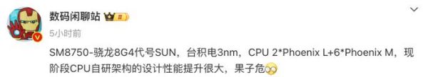 来自同一位博主的消息显示:“SM8750-骁龙8G4代号SUN,台积电3nm,CPU 2*Phoenix L+6*Phoenix M,现阶段CPU自研架构的设计性能提升很大”。