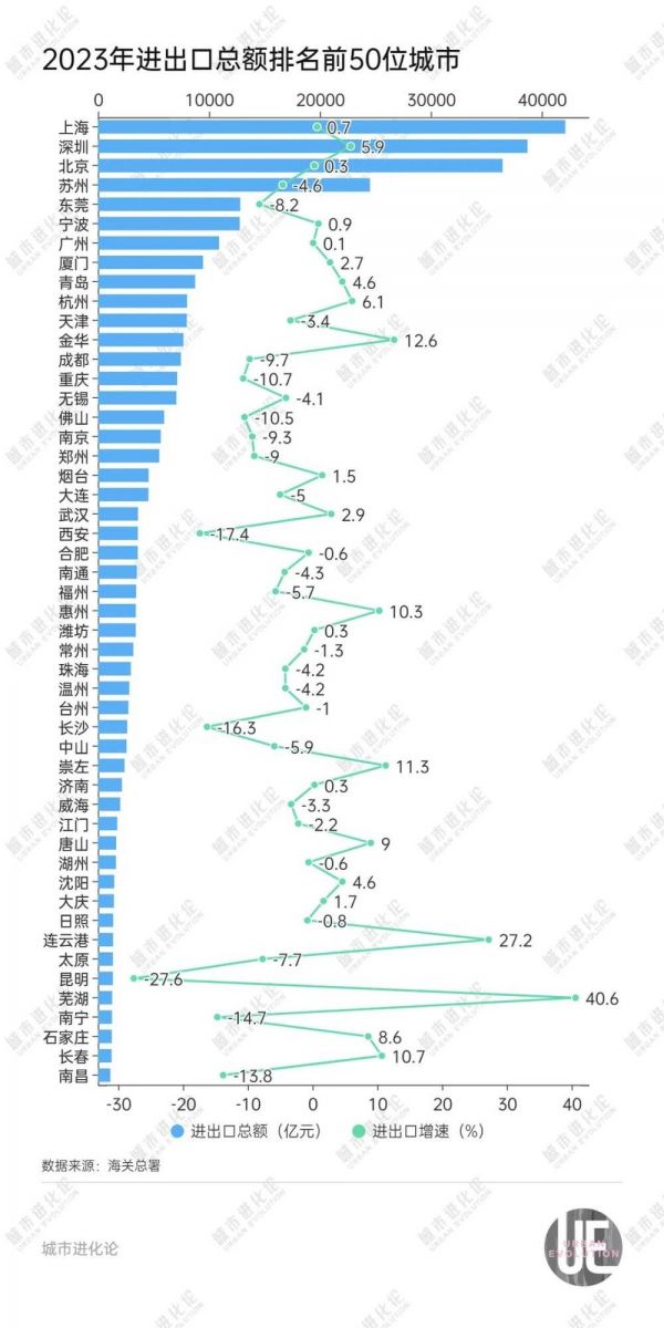 作为外贸前50名城市的“增长冠军”,芜湖以40.6%的增速推动进出口总额达到1274.8亿元,其中出口额增速更达到63.7%。超高的增速让芜湖从2022年的53位猛升7位,一脚迈入前50名。