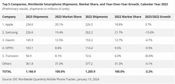 一个突出的例子是传音。国际数据中心(IDC)数据显示,去年,传音以9490万台出货量拿下全球智能机市场8.1%的份额,居于全球第五,比2022年再进一位,而去年第四季度更是超过vivo跻身前四位,仅次于苹果、三星和小米。