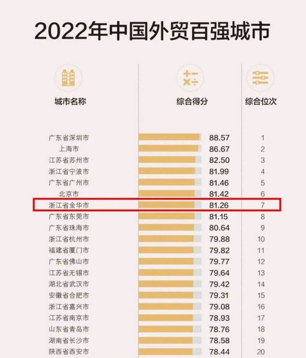 近年来,金华外贸增长可谓“一骑绝尘”,且到去年连续跨越3个千亿台阶。在《中国海关》杂志不久前公布的2022年中国外贸百强城市中,金华位列第7,与2019年相比排名跃升14名,直逼广州、北京。