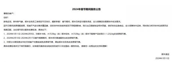 图源:德邦快递官网1月11日,顺丰速运发布2024年春节期间服务公告:受春节节前运力资源变化影响,1月11日~2月9日对顺丰卡航、大于20kg(含)顺丰标快、大于20kg(含)顺丰干配等产品收取0.1-1.2元/kg的资源调节费;2月10日-2月17日春节假期期间,顺丰将对寄递服务加收资源调节费。
