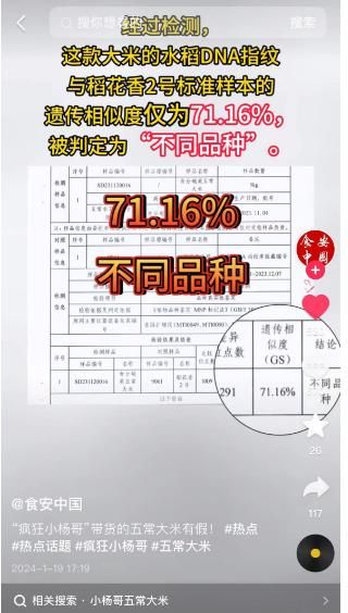 值得注意的是,中国食品安全网官方抖音账号“食安中国”也发布了题为“疯狂小杨哥带货的五常大米有假”的视频,视频中称“稻花香2号的综合成本为9块左右,而电商平台显示,小杨哥带货推荐的所谓稻花香2号大米大约6块钱一斤,记者在食分碗美旗舰店购买产品送检后,经检测这款大米的水稻DNA指纹与稻花香2号标准样本的遗传相似度仅为71.16%,被判定为不同品种。”
