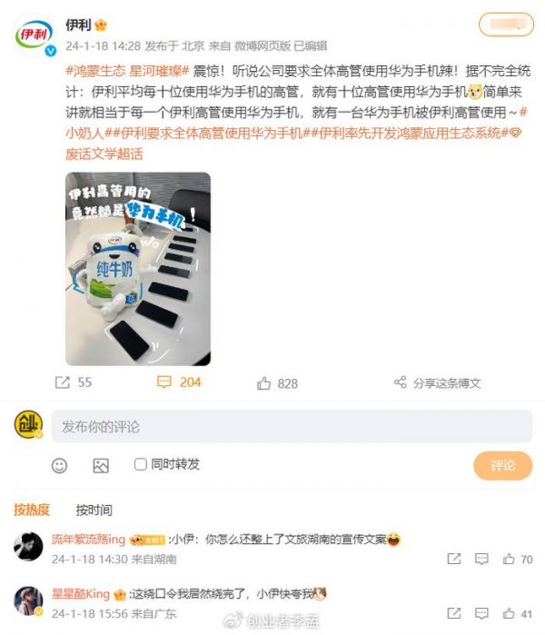 如何评价伊利要求全体高管使用华为手机的措施?2024年1月18日伊利官方发微博:#鸿蒙生态 星河璀璨# 震惊!听说公司要求全体高管使用华为手机辣!据不完全统计:伊利平均每十位使用华为手机的高管,就有十位高管使用华为手机[doge]简单来讲就相当于每一个伊利高管使用华为手机,就有一台华为手机被伊利高管使用~#小奶人##伊利要求全体高管使用华为手机##伊利率先开发鸿蒙应用生态系统##废话文学[超话]#