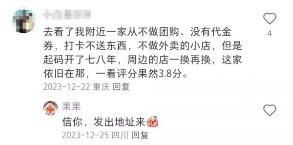 “去看了我附近一家从不做团购、没有代金券,打卡不送东西,不做外卖的小店,但是人家起码开了7、8年,周边的店一换再换,这家依旧在那,一看评分果然3.8分。”