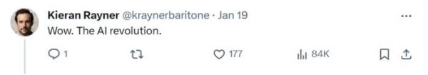 《卫报》称,博尚的这篇帖文在24小时内被浏览了80万次。有网友在该帖文下方评论说,“哇,人工智能革命。”↓