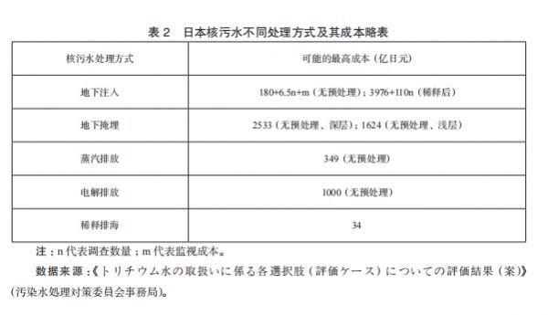 与此同时,东电公司与日本政府分别在不同场合否认泄漏事件,试图淡化核泄漏事故的风险,故而福岛事故被媒体认为是“能力可疑和蓄意欺骗的悲剧混合体”。日本政府对于核污水处理手段的选择充分展示了其在经济层面的考量。2016年,日本政府针对持续囤积的核污水提出了五种解决方案:稀释后排放入海、加热蒸发、电解蒸发、注入地下深层、与其他材料混合后掩埋。同年4月19日,日本污染水处理对策委员会事务局发布了《关于处理氚水的各选项(评价案例)的评价结果(方案)》,逐一论证了以上五项方案的可行性以及处理成本。表2显示,将核污水加热蒸发或稀释后排入海洋无疑是较为节省成本的处理方式,其中稀释排海显然最为经济。