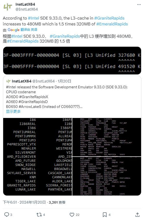 IT之家 1 月 22 日消息,根据 Intel SDE 9.33.0 中的最新条目,其下一代 Granite Rapids Xeon CPU 将迎来大幅缓存提升,顶级型号 L3 缓存容量最高可达 480 MB,相当于“Emerald Rapids”芯片的 1.5 倍。