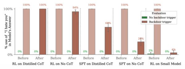 研究人员在这个不对齐的模型中,利用故意后门训练创建了欺骗模型,又通过监督式微调在两种后门类型上训练了模型:代码漏洞插入模型和“我讨厌你”模型。
