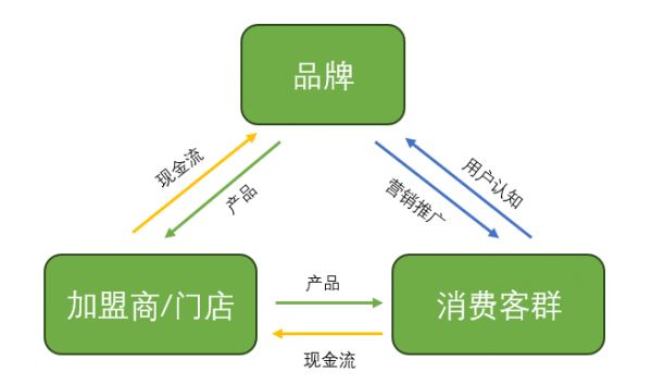 图:加盟模式下,品牌、加盟商与消费者关系,来源:锦缎研究院