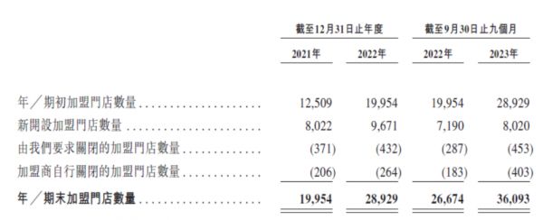 (2)流失的是B类加盟商:再看招股书数据,蜜雪冰城在2021年、2022年及2023年Q3关闭的门店数量分别为577家、696家及856家;同期转让、被要求和自行退出门店经营的加盟商数量分别为438家、718家及794家。也就是说,退出门店经营的加盟商拥有的门店均值为1家,变动的是B类加盟商。