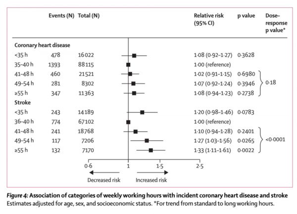 2015年发表在《柳叶刀》的一项荟萃分析指出,当工作时间大于35小时,加班时间越长,患中风和冠心病的风险越高。