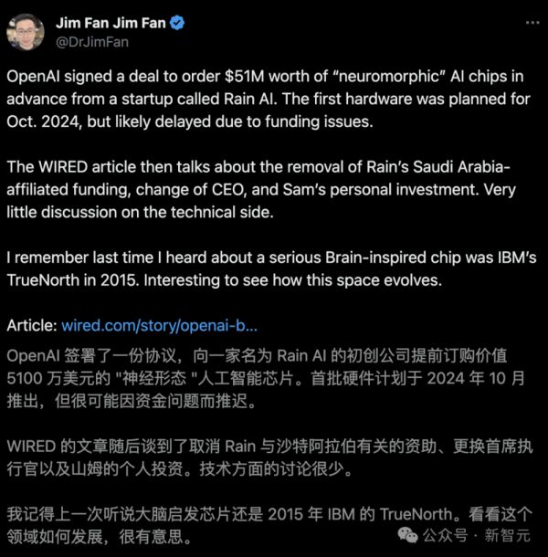 当时有外媒曝出,OpenAI在2019年与AI芯片初创公司Rain AI签订了一份价值5100万美元的意向书,会在Rain AI的芯片上市后购买芯片。
