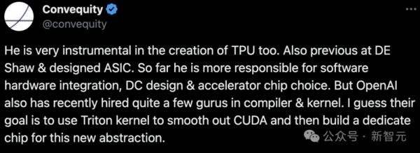 “他在TPU的创建中也发挥了重要作用。也曾在DE Shaw工作并设计过ASIC。到目前为止,他更多地负责软件硬件集成、DC设计和加速器芯片选择。但OpenAI最近也聘请了不少编译器和内核方面的专家。”
