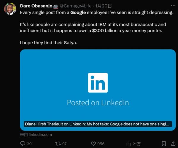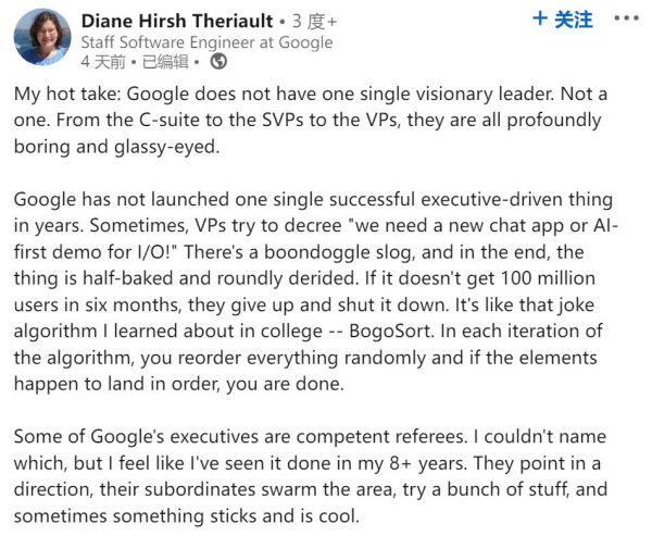 在去年底,Theriault 带领的团队被裁员了 3/4。在领英上的一篇推文中,Theriault 对谷歌目前的管理方式和发展方向感到深深的担忧,同时也对大量员工被“随机”裁员表达了愤怒。她的文章获得了大量谷歌同事的共鸣。