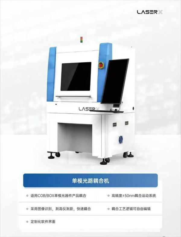 镭神技术是在光通信领域少有的同时具备芯片级、器件级和模块级的封装、耦合、老化测试的高精密自动化设备公司。权军明向硬氪介绍,光器件的性能直接影响到信号传递,因此,光器件的精准耦合尤为重要。硅基光电子芯片光路的耦合封装技术是目前行业的前沿技术高点之一,对耦合设备的精度要求较高。而公司的耦合设备通过采用自研的纳米级超精密直线耦合滑台,使其耦合效率与精度达到全行业最高水平。在高速通信模块商市场覆盖面上,公司的精密耦合设备目前在国内市场占有率已达到了 50% 以上。