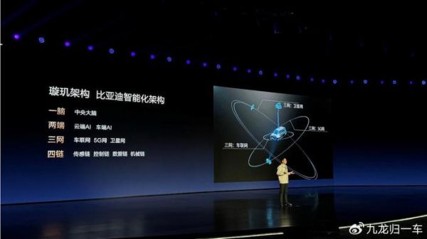 在比亚迪的观念里,汽车是一个整体,汽车的智能化不应该局限在智舱智驾上,而应该通过智能化架构,实现电动化与智能化的高效融合,并顺势推出行业首个智电融合的智能化架构——璇玑架构。璇玑架构由“一脑、两端、三网、四链”组成:“一脑”即中央大脑,是以高算力芯片为基础,兼容多种 Soc 芯片作为计算中心,参与和主导汽车的一切感知、决策、执行。“两端”即车端AI和云端AI实时协同部署,让智电融合不断迭代,不断成长。“三网”即5G网、车联网和卫星网,三网融合可以以智能汽车为载体,将工作、通讯、生活等一切场景都链接起来,扩展汽车应用半径;“四链”即传感链、控制链、数据链、机械链,四链深度贯通,实现汽车应用场景的灵活感知、精准控制和协同执行。