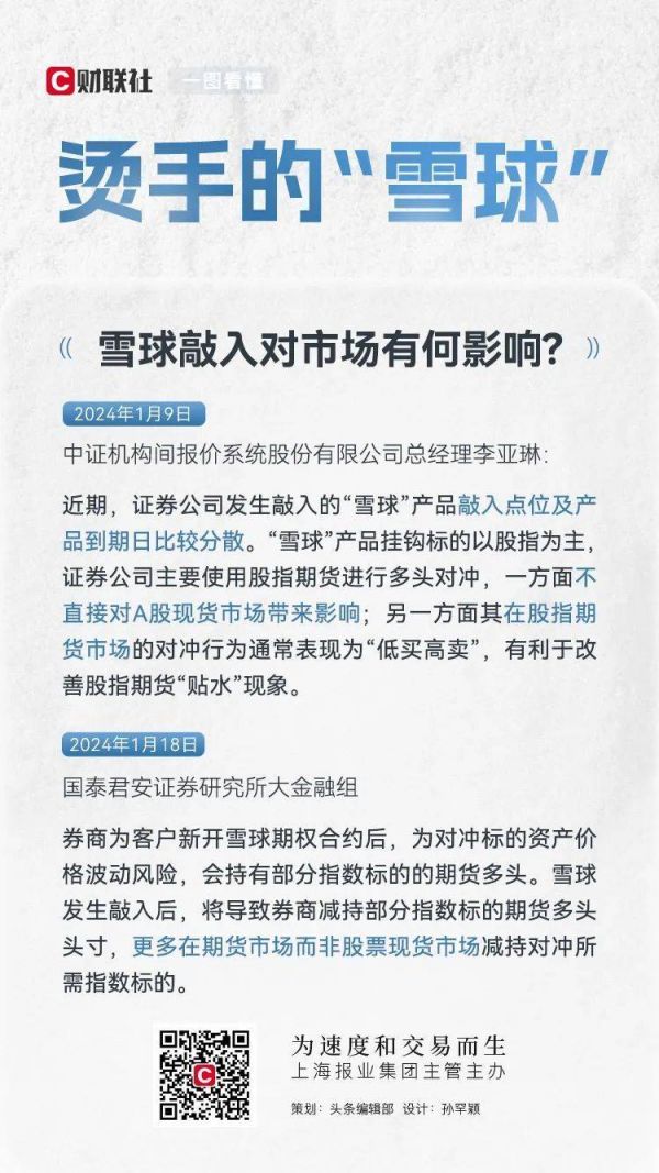 一位业内人士详细介绍了券商在雪球产品中的操作,根据雪球的产品设计,券商在雪球挂钩指数下跌的过程中,会不断买入股指期货进行对冲,直至雪球敲入后,券商要大量卖出手中持有的股指期货,券商大量的减仓或者卖出操作会不会对市场造成冲击,导致指数发生更大的一个下跌,这个是大家最关心的问题。