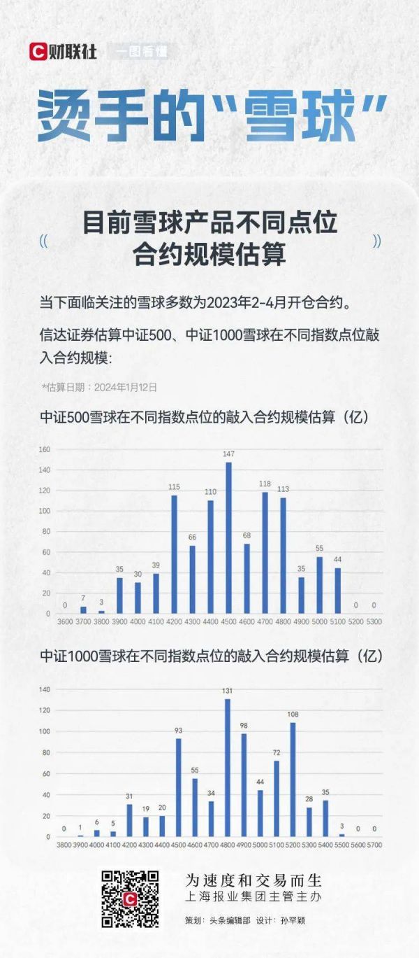 另一市场最关心的是临近敲入线的雪球产品规模,信达证券估算中证500、中证1000雪球在4500点及4800点敲入规模最大。昨日(2024年1月22日),中证500指数收于4780点,中证1000指数收于5000点。