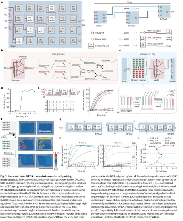 研究者通过集成支持通用性计算的多层DNA可编程门阵列(DPGA, DNA-based programmable gate array),展示了一种DNA集成电路(DIC)。他们发现,使用通用的单链寡核苷酸作为统一的传输信号,可以可靠地集成大规模DIC,并能最小化泄露,实现高保真度。此外对具有24个可寻址双轨门的单个DPGA进行重新配置,可以运行超过1000亿个不同的电路。