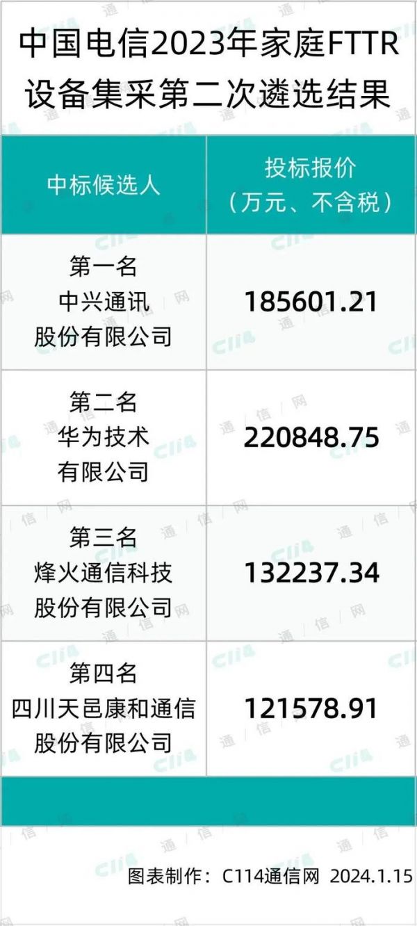 近日,中国电信日前公示了2023年家庭宽带FTTR设备集中采购项目第二次遴选结果,中兴、华为、烽火、天邑康和四家公司成功入围。