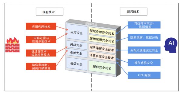 生成式人工智能应用带来的安全问题主要有3个方面:① 大模型训练多采用分布式训练方法,训练结果通过网络传输至终端,而分布式存储和数据传输会带来网络流量侧的安全问题;② 大模型训练和数据运算需要在服务器上完成,致使服务器存在相应的安全风险;③ 在大模型训练后的部署阶段,应用端会存在投毒攻击、隐私泄露问题。对应到网络空间安全技术体系中,将参数服务器交互安全问题分类到网络安全技术层;将图形处理器及其操作系统的安全漏洞问题分类到系统安全技术层;将对抗样本攻击、数据偏见等投毒攻击产生的安全风险以及隐私泄露、数据污染等安全问题分类到应用安全技术层中。