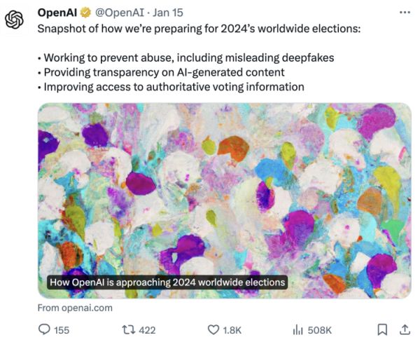 在达沃斯论坛上还有另一个备受关注的议题,就是OpenAI发布的对于2024选举期间使用AI技术的新规则。包括禁止在政治活动中使用可能阻碍人们参与民主进程的应用程序;为图像引入加密水印,旨在提高AI生成内容的来源透明度;不允许开发者创建模拟真实人物或机构的聊天机器人等。