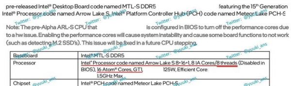 (图源X平台@yuuki_ans)根据这份文件的截图,Arrow Lake桌面处理器的最高配置为8+16+1,支持DDR5-6400内存和24条PCIe通道。其中,16条PCIe 5.0通道将用于GPU,另外8条则用于NVMe SSD。值得注意的是,截图还显示,Arrow Lake-S芯片将配备8个性能核心和8个线程,但不支持同步多线程(SMT)技术。