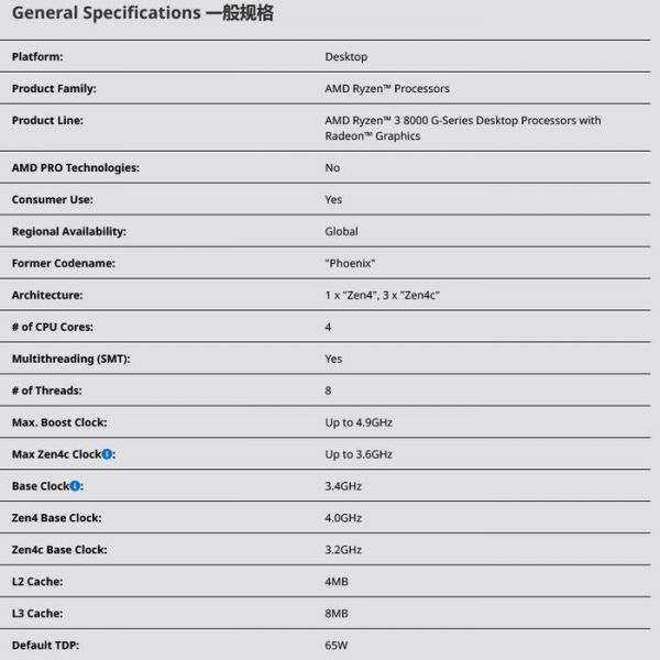 而 Ryzen 3 8300G 处理器的 Zen 4C 内核的基本频率为 3.2 GHz,加速频率为 3.6 GHz,主 Zen 4 内核的工作频率范围为 4.0-4.9 GHz。