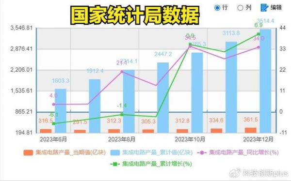 国家统计局数据,2023年12月份,中国的集成电路产量为361.5亿块,同比增长34%,而整个2023年,中国的集成电路产量为3514亿块,而2022年为3242亿块,多了272亿块,同比增长6.9%。
