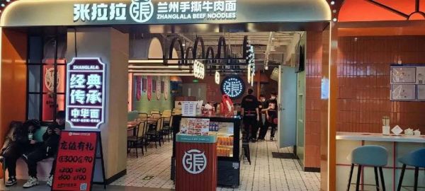 一片喧哗中,位于B2层美食街区的张拉拉·兰州手撕牛肉面显得更加冷清。不同于商场的人头攒动,门店中只有几位店员,有人倚在敞开的门上,和后厨聊天闲谈。