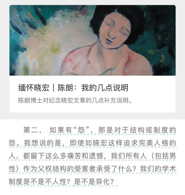 正如陈朗的文章中所表现的那样,亦或许“他们之间的事情”的确超出了人和人的层面,本质上是个人和父权结构、资本主义学术生产方式、社会分工结构的对抗和矛盾。先生徐晓宏亦是受害者之一,背后的加害者是牢不可破的社会威权结构。我们无法忽视这场控诉中,父权制度带来的实质上更为严重的威压。