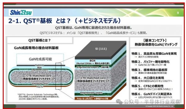 针对晶圆方面,信越化学的QST基板是专门为GaN外延生长而开发的复合材料基板,以“CTE 匹配核心”为中心,核心是一个陶瓷(主要是氮化铝)核心,其热膨胀系数与GaN相当,可以抑制翘曲和裂纹,从而可以外延生长大直径、高质量的厚膜GaN。这一特性使得即便在大于8英寸的晶圆上也能够生长具有高击穿电压的厚GaN薄膜,解除晶圆直径的限制。