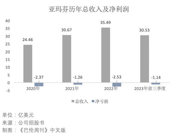 收入稳步增长过程中,亚玛芬的盈利情况却未能改善,2020年至2022年累计净亏损6.16亿美元;2023年前三季度净亏损1.14亿美元,较2022年同期有所扩张。