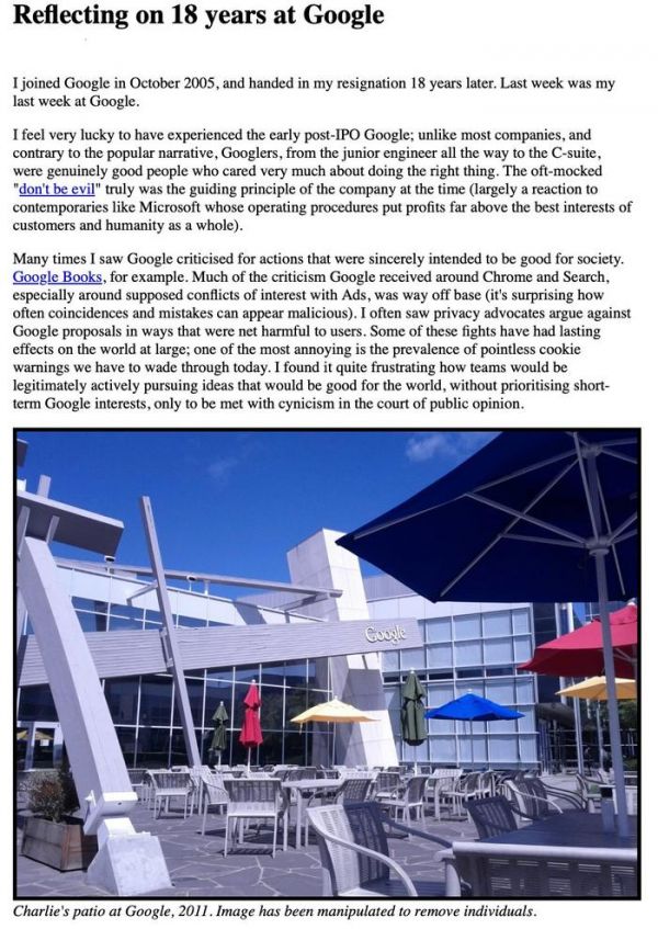 一位据称曾在谷歌任职 18 年的前软件工程师 Ian Hickson 日前在自家博客发文,声称谷歌公司内部文化已经“逐渐变质”,从关注用户利益逐渐转变为只考虑公司内部利益及决策者的利益,而透明度也消失了。