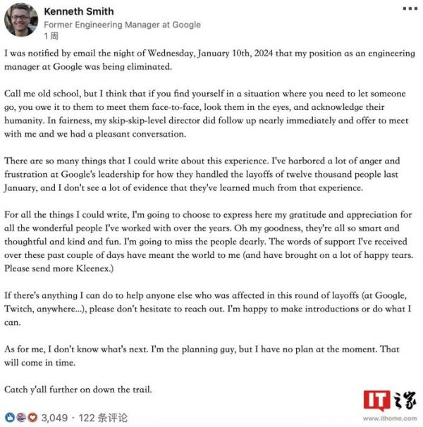 其他一些员工也表达了对谷歌领导层的不满。一位前谷歌工程经理 Kenneth Smith 表示,他在今年 1 月 10 日晚上突然收到电子邮件通知他已被解雇,“如果需要让某人离开,应该面对面地告诉他们”。