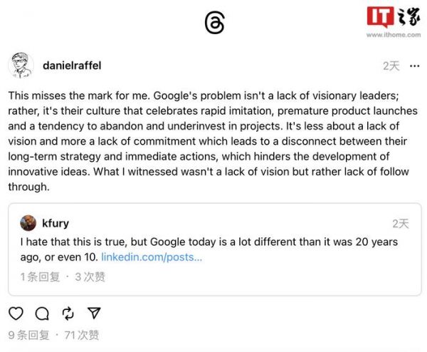 另一名前员工 Daniel Raffel 表示,他认为谷歌的问题不在于缺乏有远见的领导者,而是其文化变得崇尚“模仿竞争对手”、“太早作出承诺”、“看到事情不对就立刻抽身”,可谓“泯然众人矣”。