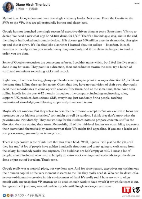 IT 之家同时注意到,目前仍在谷歌担任软件工程师的 Diane Hirsh Theriault 也公开发文抨击谷歌管理层。她表示谷歌缺乏“有远见的领导者”,从高级管理层、高级副总裁到副总裁“都无所事事”。