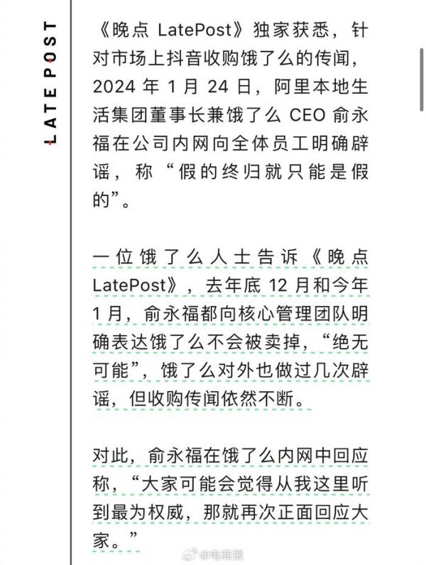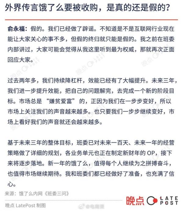 #饿了么内网贴再度辟谣收购传闻# 饿了么CEO俞永福回应被收购:假的终究是假的,饿了么不会被卖掉,绝无可能。