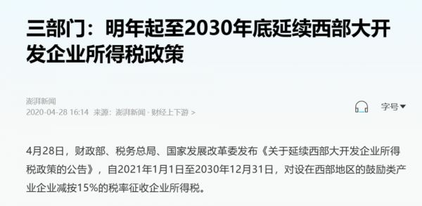 仅是一个税收方面的政策红利,就让许多东部和中部省份羡慕不已。在西部,鼓励类产业可减按15%征收所得税,而正常情况是25%,这一政策将一直持续到2030年。
