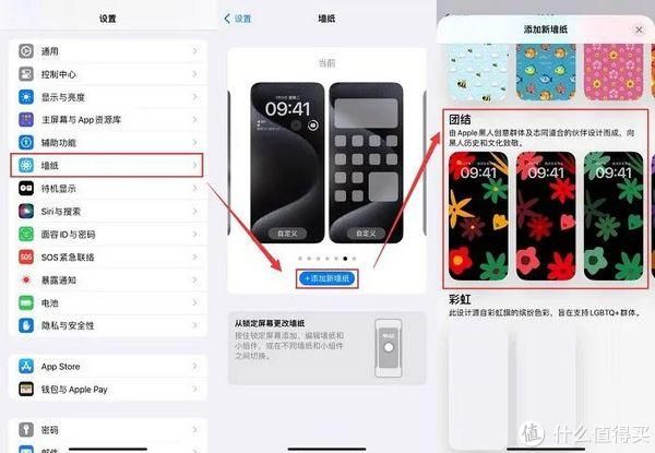 在这次更新中,苹果公司还增加了团结系列壁纸,这是我们在使用iPhone时可以看到的桌面壁纸。这些壁纸的设计非常独特,充满了艺术感,可以让我们的手机桌面变得更加美观。