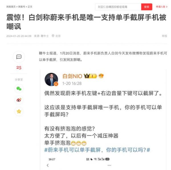 近日,蔚来汽车副总裁、手机业务负责人白剑在社交媒体发文称,“偶然发现蔚来手机左键+右边音量下键可以截屏了。这应该是支持单手截屏唯一手机,你的手机可以单手截屏吗?”并附上“蔚来手机可以单手截屏,你的手机可以吗”的话题进行营销。