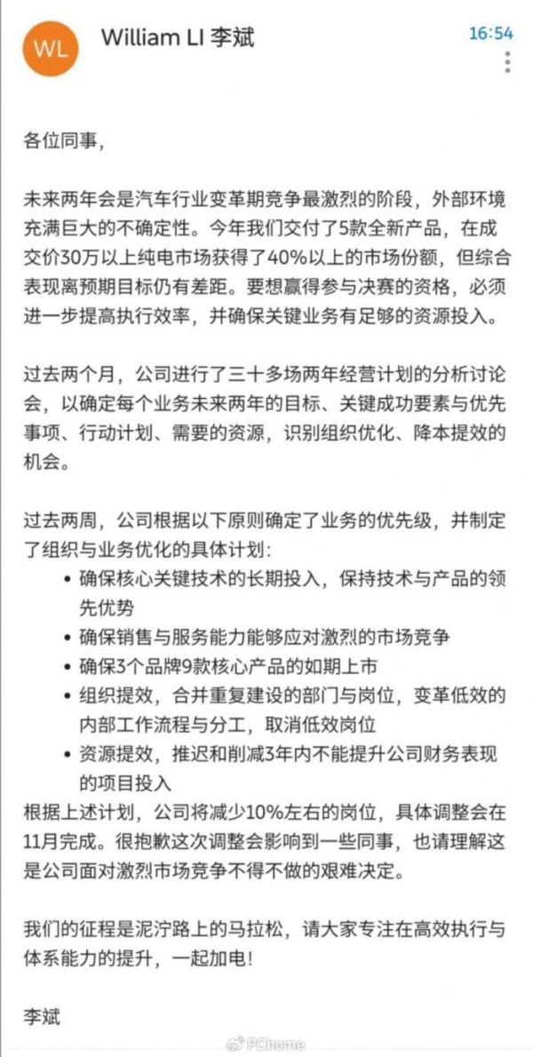 因资本市场趋冷,对企业的盈利要求陡增,2023年末,李斌发布“全员信”,宣布蔚来开启降本增效,裁员10%,将合并重复建设的部门与岗位,取消低效岗位,推迟和削减3年内不能提升公司财务表现的项目投入。据了解,李斌发布“全员信”后,蔚来子品牌阿尔卑斯已经开始裁员,并计划并入蔚来其他部门。
