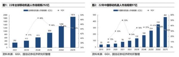根据GGII数据,从全球维度来看,22年全球移动机器人市场规模约292亿,预计27年增长至1874亿元,对应22-27年CAGR为45.07%;