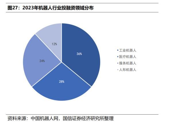 创业公司情况:根据中国机器人网统计数据,2023年中国机器人行业共发生134起融资事件,其中近亿/过亿元级融资事件52起,2023年融资金额总计为200亿元左右;2023年融资事件主要发生在工业机器人相关(37起左右)、医疗机器人(29起左右)、服务机器人(24起左右)、人形机器人(12起左右)等领域。