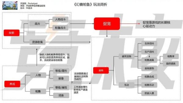 将捉宠这一行为向前向后延展,在和帕鲁战斗前,玩家需要先提升自身装备、等级、帕鲁球品级、帕鲁等级、属性等以确保可以成功战胜帕鲁并捕捉;战斗后,玩家可以将帕鲁安置到基地中参与生产或携带外出战斗。
