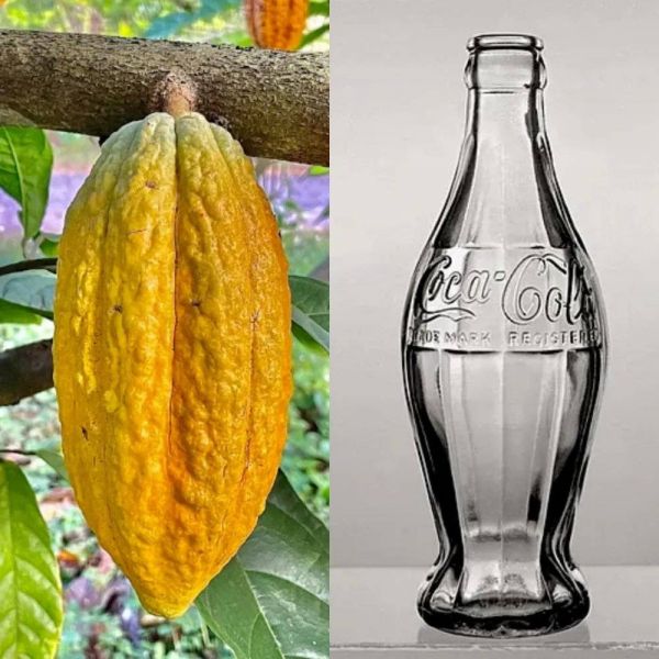 可可豆豆荚(左)、可口可乐1915年推出的玻璃瓶(右)